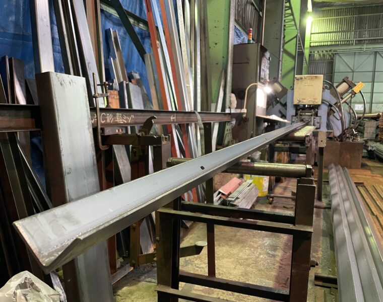 長い寸法の等辺山形鋼(アングル)に孔あけ加工を行います。